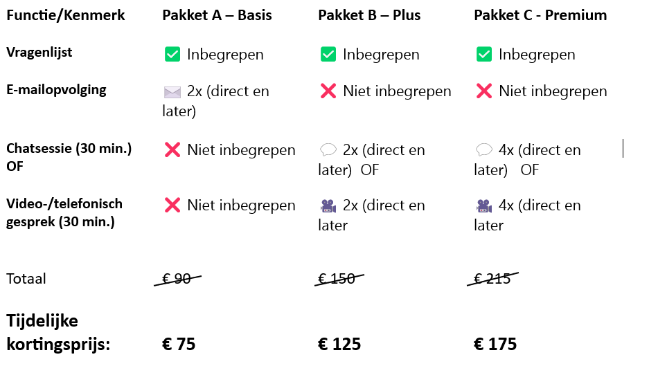 Er zijn 3 pakketten mogelijk, maar op verzoek en in overleg kan er een ander pakket samengesteld worden.